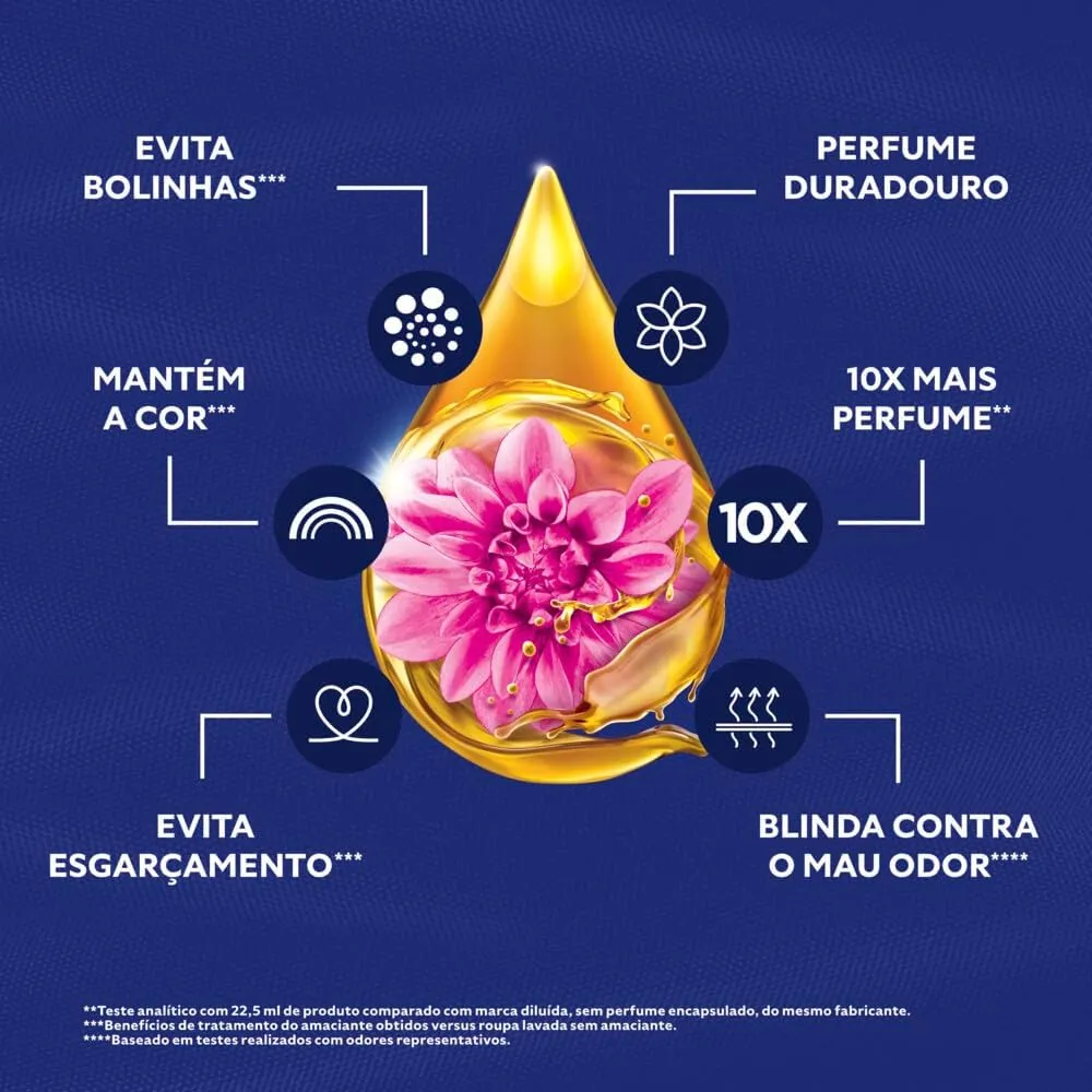 Os ingredientes de comfort concentrado são capazes de alinhar e proteger o tecido, reduzindo o atrito entre as fibras de suas roupas durante o processo de lavagem. O cuidado intensivo de comfort funciona da mesma forma que um condicionador para cabelos: alinha os fios, mantém sua forma original e ajuda a controlar a quebra das fibras, reduzindo futuros danos nas peças.