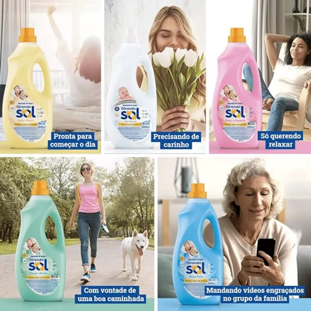 Transforme sua rotina de cuidados com as roupas com o Girando Sol Amaciante Tradicional Frescor Herbal, agora disponível em uma embalagem conveniente de 2 litros.