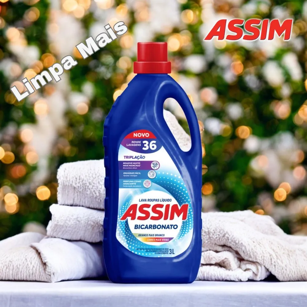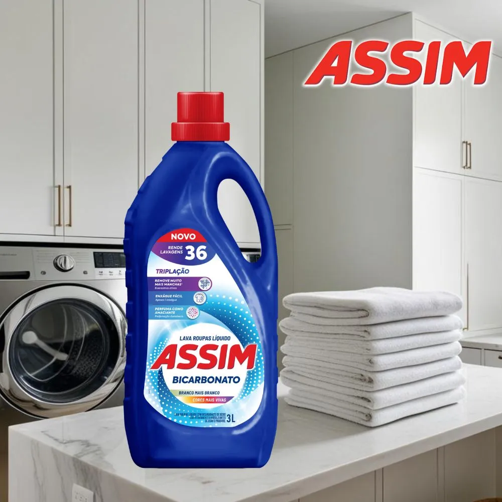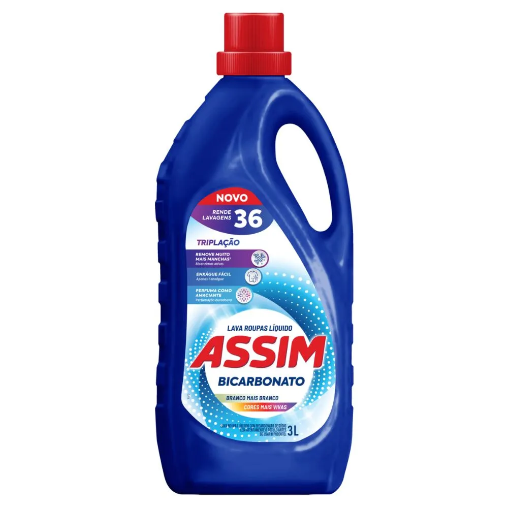 O Lava Roupas Líquido Assim com Bicarbonato possui uma fórmula exclusiva com o poder de tripla ação, que remove uma ampla variedade de manchas, através das bioenzimas ativas, perfuma como amaciante e proporciona enxágue fácil, sendo necessário apenas um enxágue.